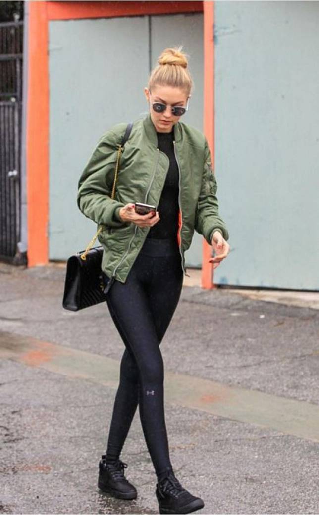 1. Seperti Gigi Hadid, kita harus punya basic bomber jacket dengan warna hijau lumut, nih. Pasangkan dengan dalaman hitam dan legging biar makin kece.