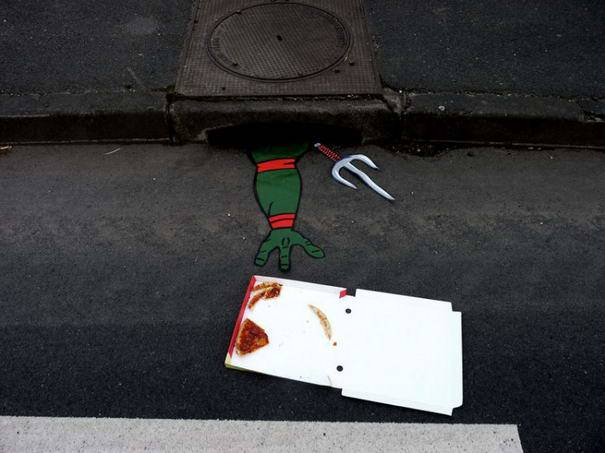 4. Seolah ada tangan yang keluar dari saluran air untuk mengambil pizza.
