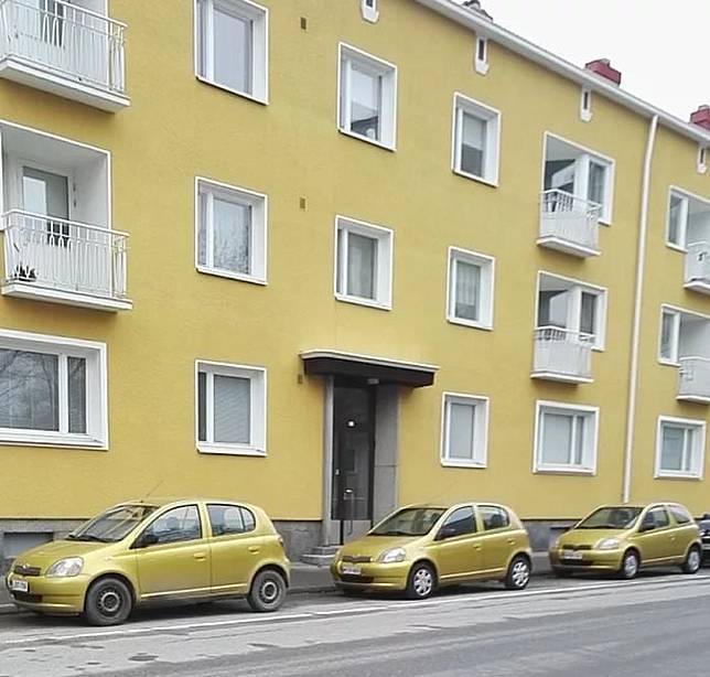 1. Secara kebetulan gedung dan mobil yang parkir warnanya sama. Tapi nggak cuma satu loh, tiga mobil!