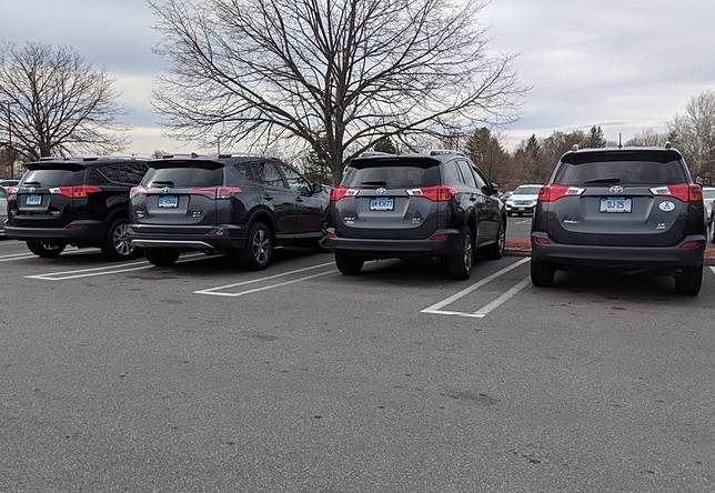 7. Empat mobil di parkir sebelah-sebelahan dengan warna, tipe, dan merek yang sama. Hehehe. Janjian kayaknya nih.
