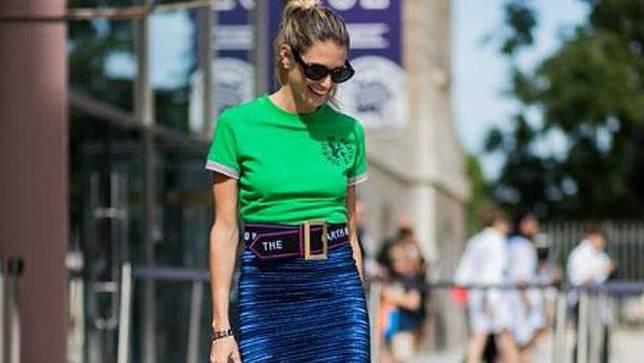 Saat Anda mengenakan kaos berwarna hijau, coba padukan dengan pilihan bawahan yang warnanya lebih gelap. Misalnya rok pensil warna biru tua. Agar tak berkesan membosankan, tambahkan sentuhan ikat pinggang besar sertahigh heels warna nude. Cocok Anda pencinta gaya fashion yang feminin dan sedang ingin terlihat kasual.